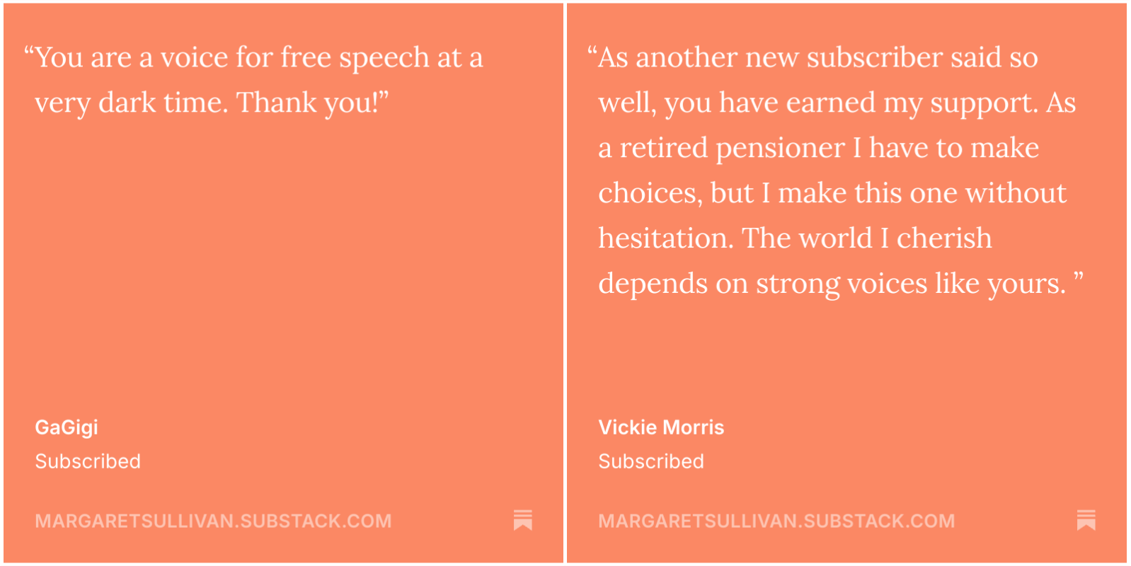 Here’s why two (very kind) readers decided to become paid subscribers. Point of information, only about four percent of the total subscribers to this newsletter are paid subscribers. I appreciate all who subscribe and read; but if you have the means — $50 a year or $8 a month — you will help me continue this effort without resorting to a paywall. I want to keep it accessible to all.