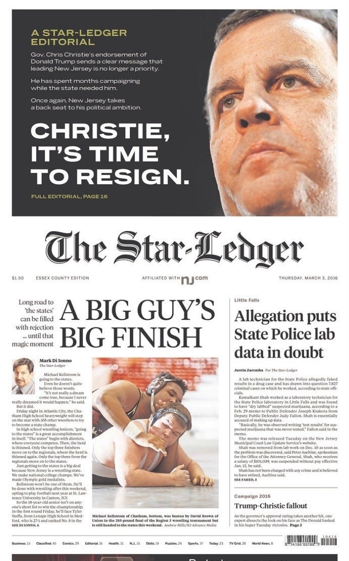 Even a prominent teaser to an inside editorial — as the Newark Star-Ledger did in 2016 when it urged scandal-ridden New Jersey governor Chris Christie to resign — would make a strong statement.