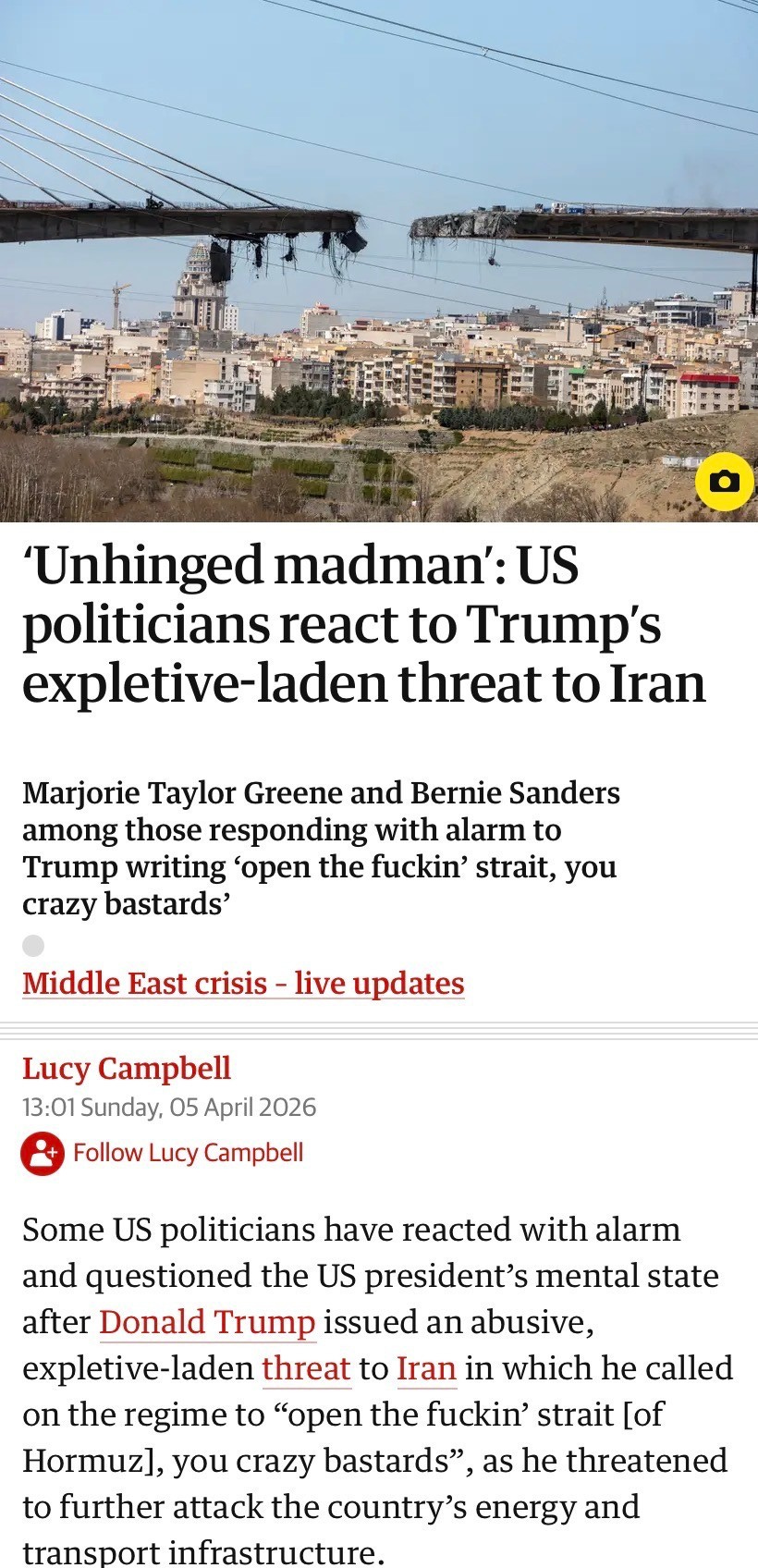 Second, use headline language and story placement to get across how truly radical Trump’s behavior is. I thought that the Guardian US did a good job with that in a story (not its main news article but a prominently placed sidebar) that carried this headline: ‘Unhinged madman’: US politicians react to Trump’s expletive-laden threat to Iran.” The Guardian used Trump’s full language in the second paragraph and quoted former Congresswoman and former Trump ally Marjorie Taylor Greene urging her follow Republicans: “I know all of you and him and he has gone insane, and all of you are complicit.” It also quoted independent senator Bernie Sanders: “These are the ravings of a dangerous and mentally unbalanced individual.” (Disclosure: I write regularly for the Guardian US.) The Times had a somewhat similar story, the lead paragraph of which described a message “stunning for its crude combativeness and profanity.” That bluntness was appropriate.