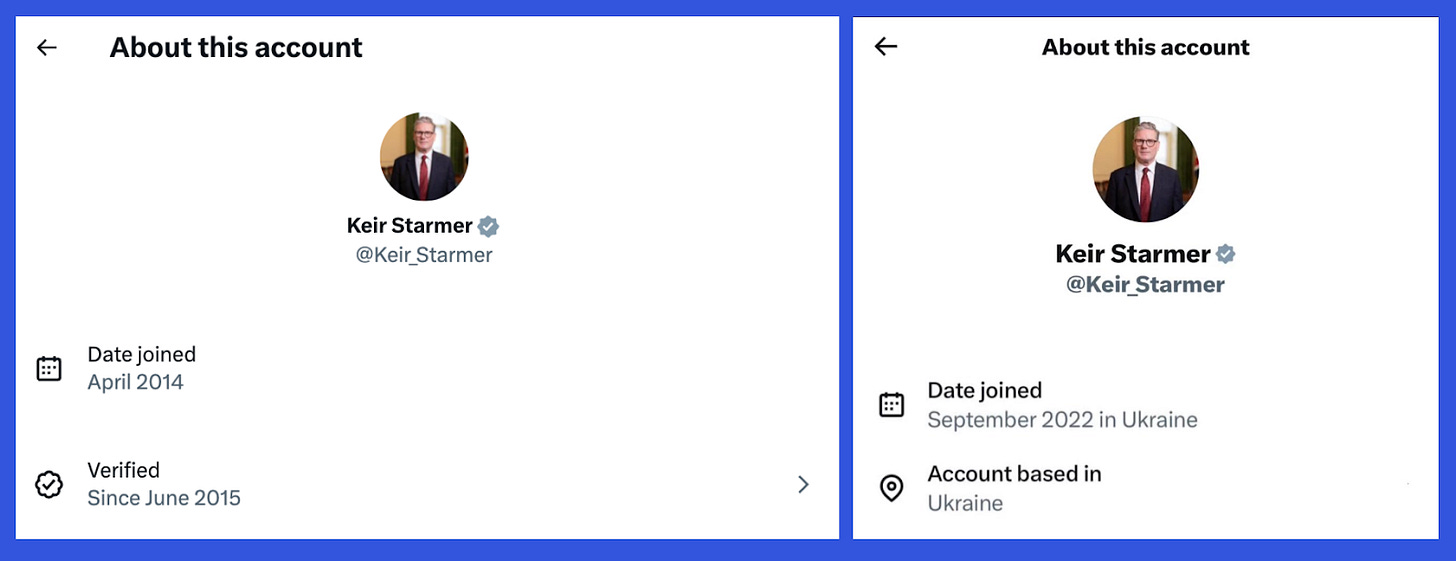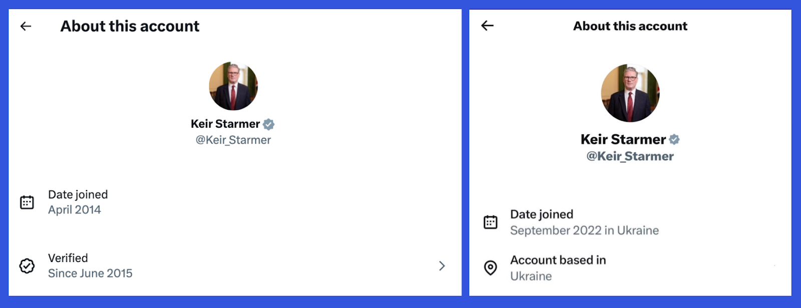 - Starmer’s X account does not display any information about where the account is based, besides a self-designated United Kingdom geotag in its bio.