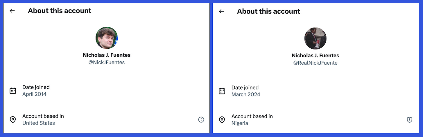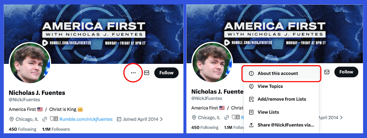 Actually: The screenshot did not capture Fuentes’ real X account (@NickJFuentes), which shows he is, in fact, based in the U.S. Instead, the post showed the location information for an impostor account (@RealNickJFuente) as being based in Nigeria.