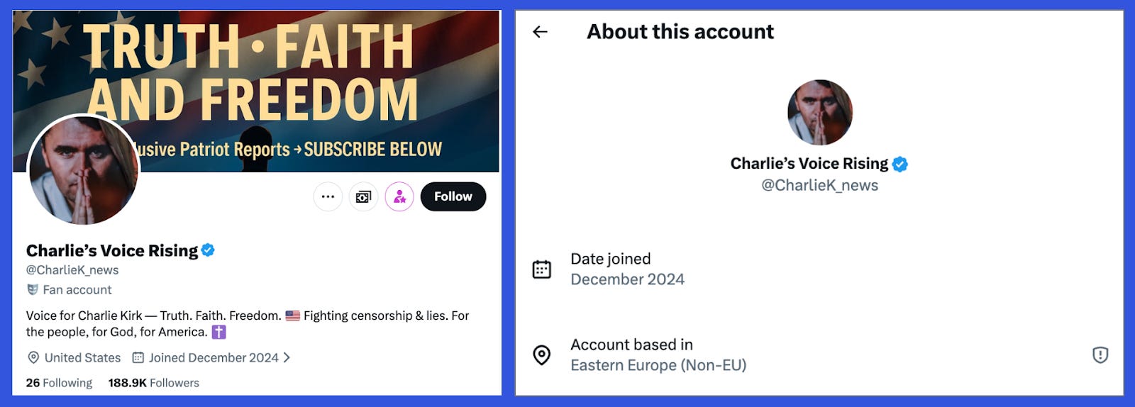 Eastern European Charlie Kirk fans: The account @CharlieK_news, which presents itself as a tribute account for the late conservative influencer Charlie Kirk, states that it is based in the U.S. in its bio. It is actually based in “Eastern Europe (Non-EU),” according to X’s new location feature.