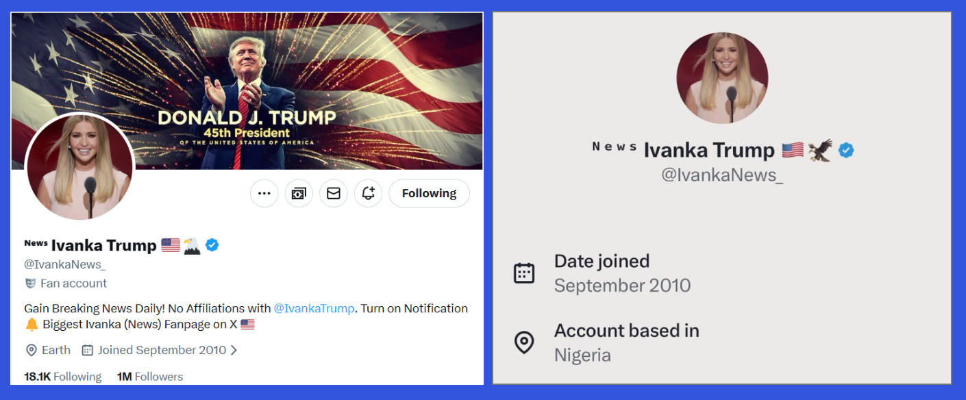 Nigerian Ivanka Trump fans: As first identified by The Daily Beast, X page @IvankaNews_, which has an American flag in its profile name, is actually based in Nigeria, according to X. The account, which had 1 million followers, was suspended by X for violating the platform’s rules on Nov. 24, according to X.