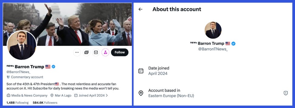 Eastern European Barron Trump fans: The location of the X account @BarronTNews_ is in an Eastern European country that is not part of the European Union, according to X, despite having an American flag in its profile name and posting almost exclusively about U.S. politics.