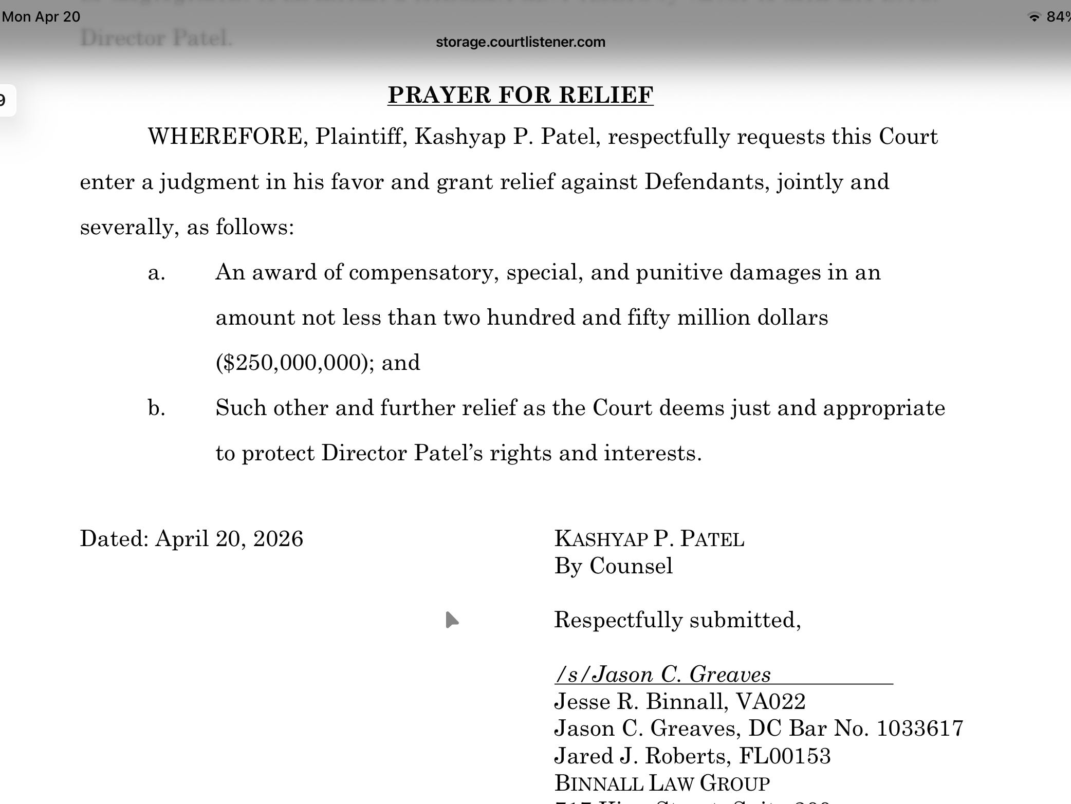 The complaint continues by discussing the article in The Atlantic, whose intent, it claims, was telegraphed by the headline: “it was not journalism about a subject; it was advocacy against Director Patel. Defendants made no effort to disguise their aim.” The headline read, “Kash Patel’s Erratic Behavior Could Cost Him His Job.”
