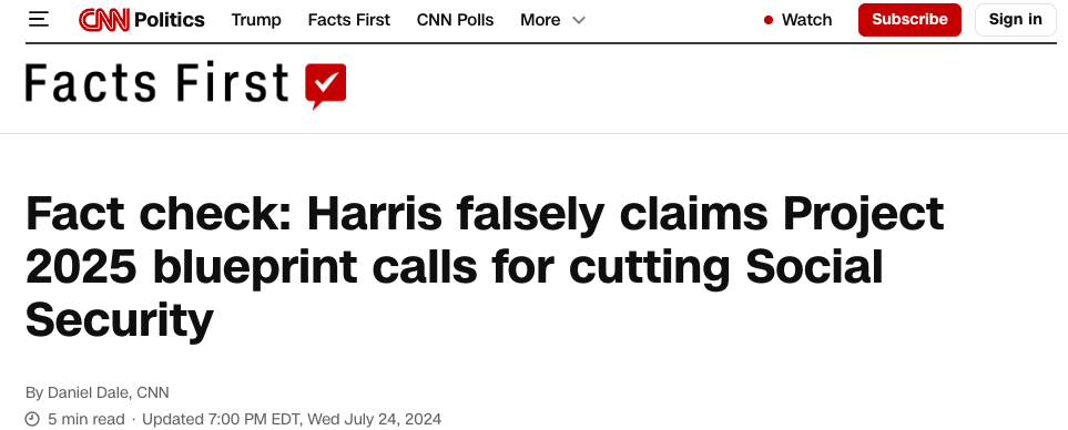 When Harris, at her first campaign rally after becoming the presumptive nominee, said that Project 2025 showed Trump “intends to cut Social Security and Medicare,” CNN’s fact-checker Daniel Dale wrote that this was “false” because “the Project 2025 document does not show that Trump intends to cut Social Security.” Which tells you something about how this worked: because the document wasn’t literally authored by Trump, claims about what Trump “intends” to do based on it were deemed inaccurate.