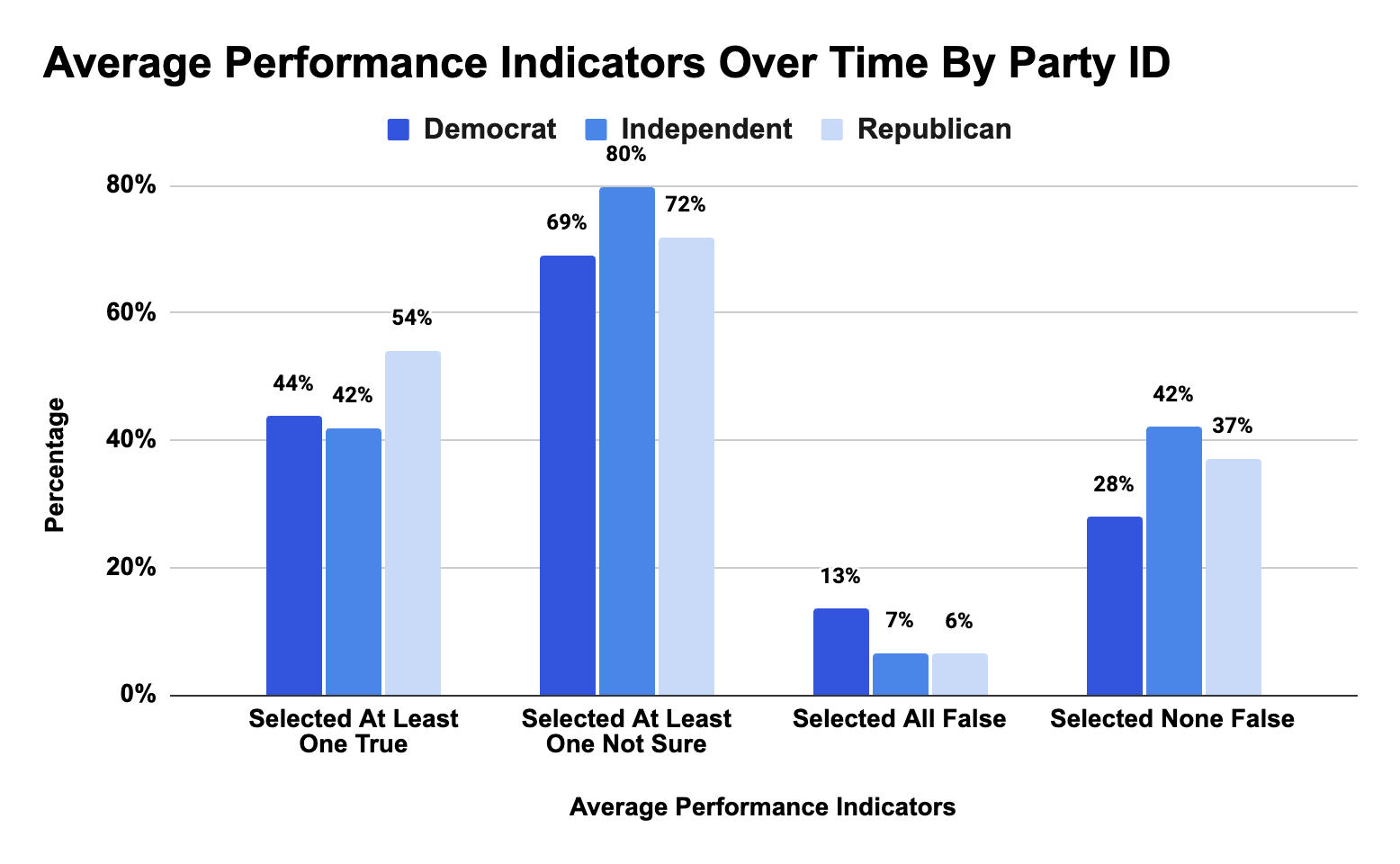The most significant differences between party lines fall with acknowledging uncertainty when presented false claims. Eighty percent of Independents selected “Not sure” for at least one claim, compared with 69 percent of Democrats and 72 percent of Republicans, suggesting that Independents are more likely to be skeptical of claims they encounter.