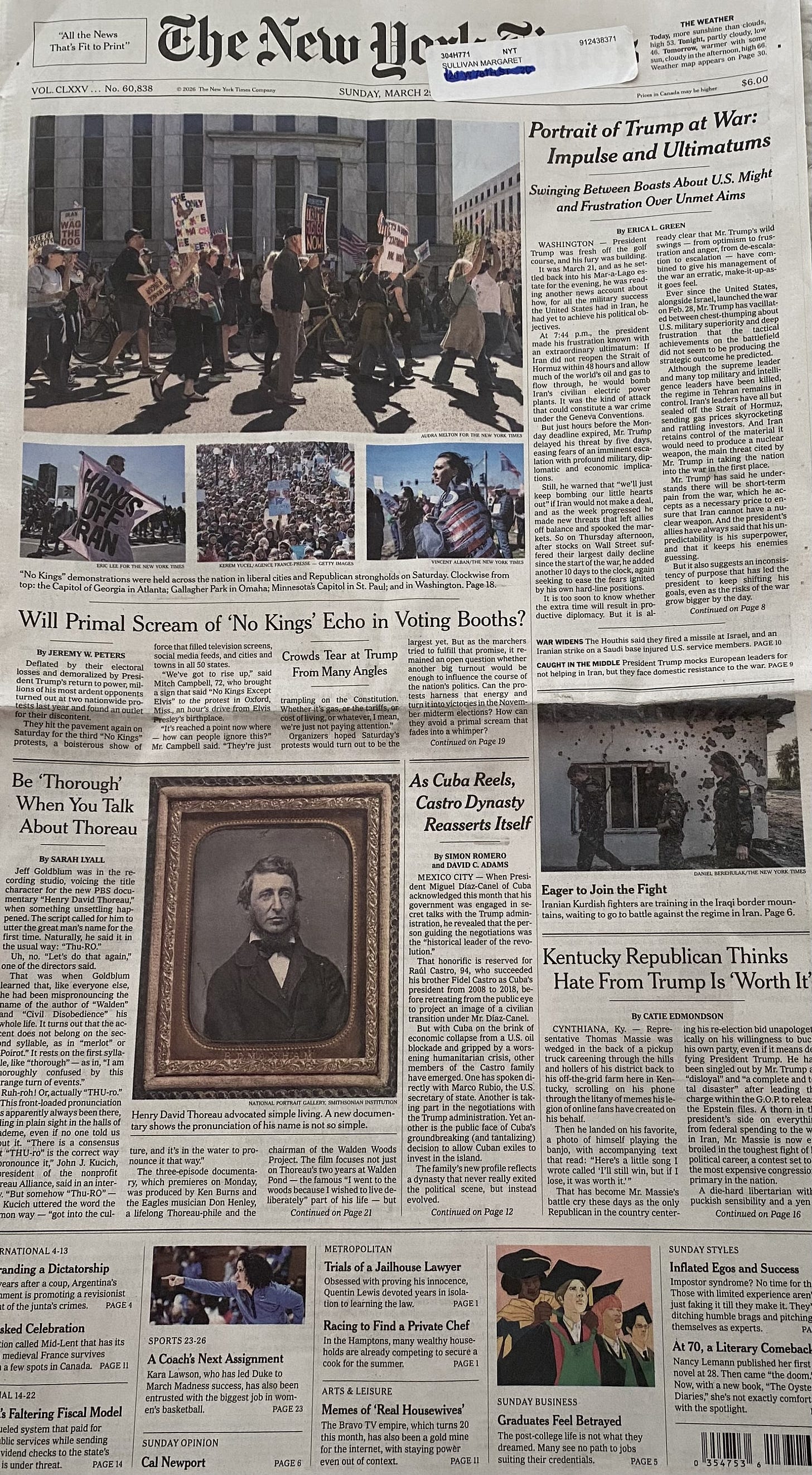 On another subject: The New York Times drew lots of angry criticism last year for not giving enough attention to the massive “No Kings” protests around the country. I dinged them myself last time for having only a small photo presence on the print Sunday front page, teasing to a story inside.
