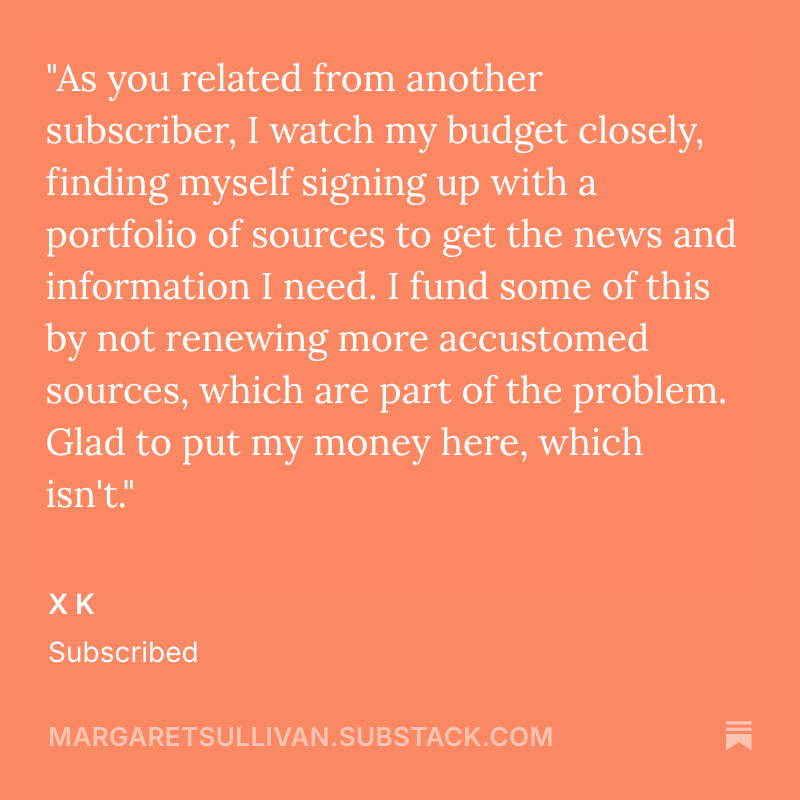 Readers, thank you so much for being here, for subscribing, sharing, commenting and caring about journalism and democracy. Your interest and support means a great deal to me, and I’m grateful.