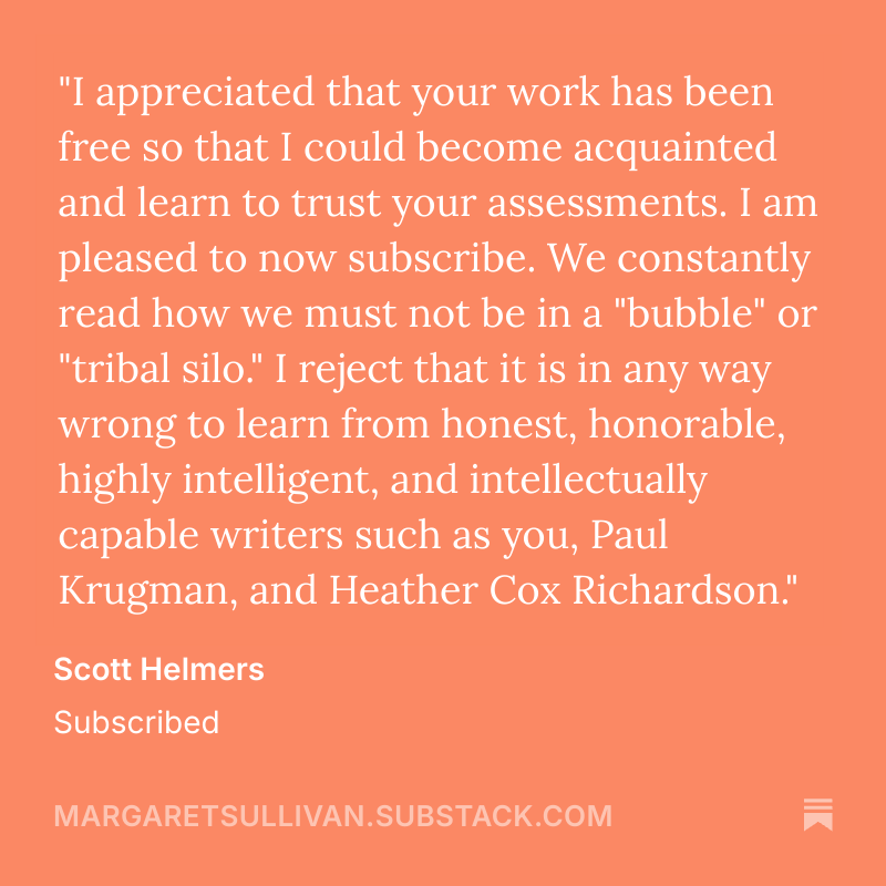 What I ask of you: Last fall, I removed the paywall so that everyone could read and comment. I thought it was important in this dire moment and might be helpful. If you are able to subscribe at $50 a year or $8 a month, or upgrade your unpaid subscription, that will help to support this venture — and keep it going for all. Thank you!