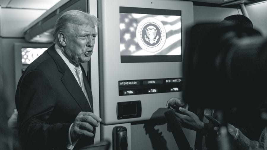 Donald Trump speaks to reporters aboard Air Force One. (Photo by Roberto Schmidt/Getty Images)