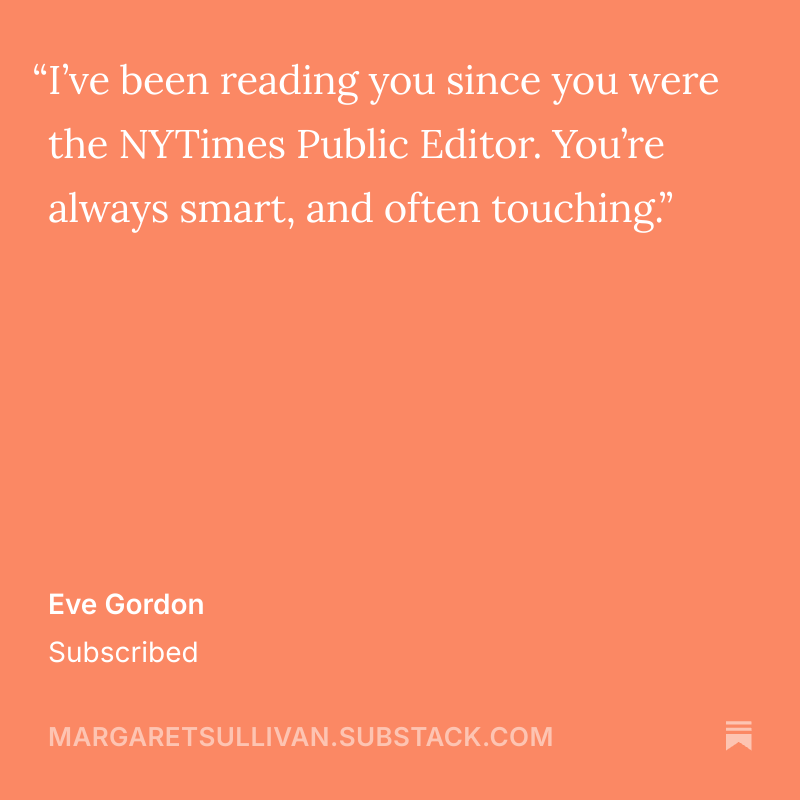 My background: I am a Lackawanna, NY native who started my career as a summer intern at the Buffalo News, my hometown daily. After years as a reporter and editor, I was named the paper’s first woman editor in chief in 1999, and ran the 200-person newsroom for almost 13 years. Starting in 2012, I served as the first woman “public editor” of the New York Times — an internal media critic and reader representative — and later was the media columnist for the Washington Post. These days, I write here on Substack, as well as for the Guardian US, and teach an ethics course at Columbia Journalism School. I’ve also written two books and won a few awards, including three for defending First Amendment principles.