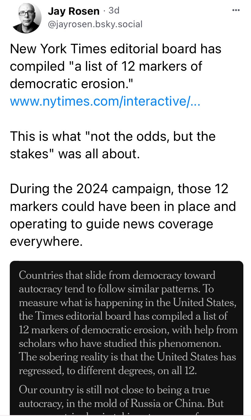 A few days ago, Rosen pointed out a piece in the New York Times that was an excellent example of focusing on the stakes: 12 markers of how democracy is eroding in the United States. Here’s a gift link.