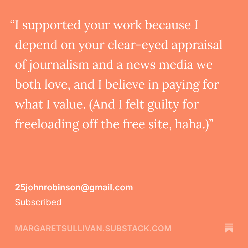My background: I am a Lackawanna, NY native who started my career as a summer intern at the Buffalo News, my hometown daily. After years as a reporter and editor, I was named the paper’s first woman editor in chief in 1999, and ran the 200-person newsroom for almost 13 years. Starting in 2012, I served as the first woman “public editor” of the New York Times — an internal media critic and reader representative — and later was the media columnist for the Washington Post. These days, I write here on Substack, as well as for the Guardian US. I’ve also written two books, taught journalism ethics, and won a few awards, including three for defending First Amendment principles.