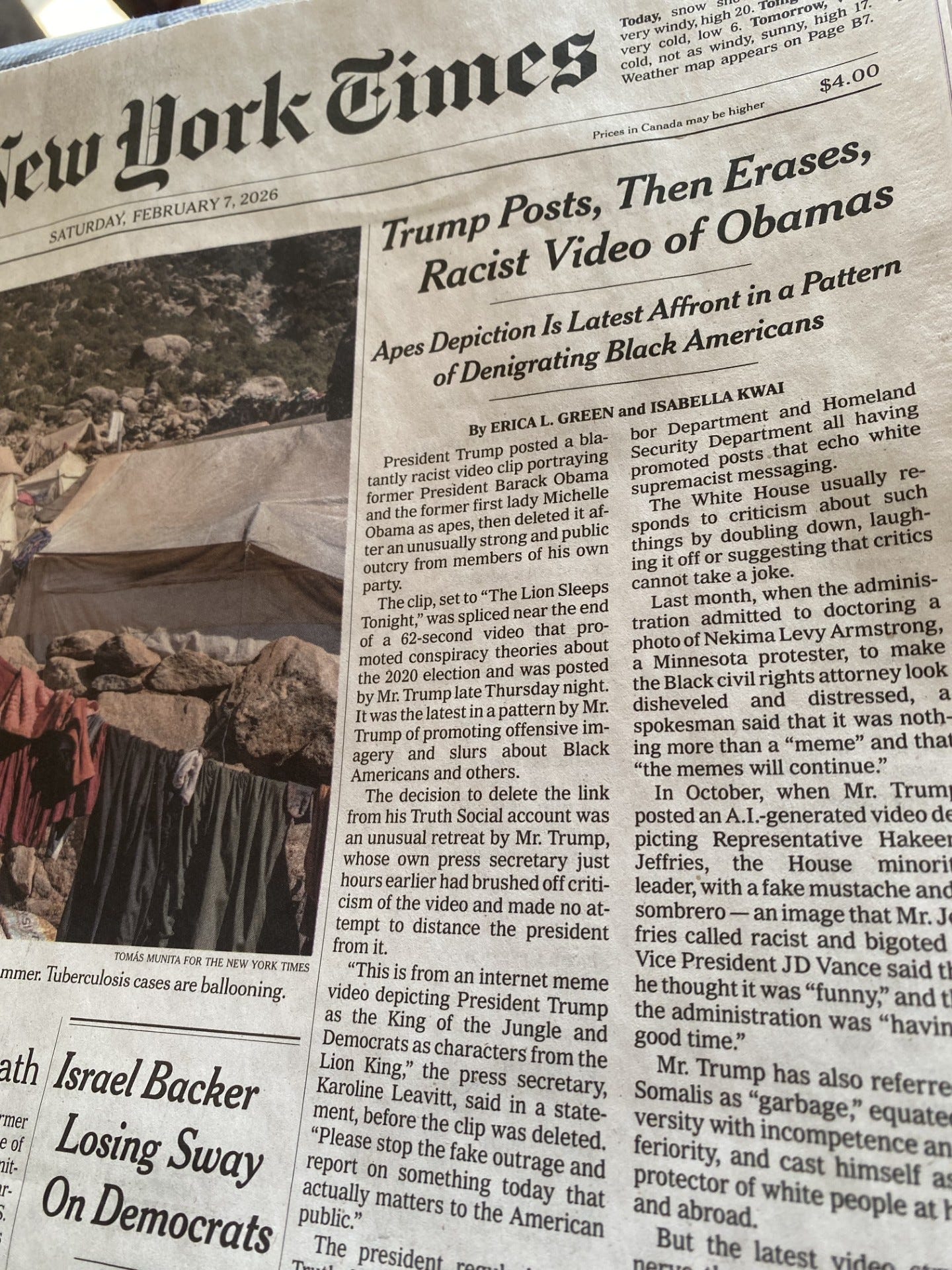 Here was the lede: “President Trump posted a blatantly racist video clip portraying former President Barack Obama and the former first lady Michelle Obama as apes, but he insisted he had nothing to apologize for even after he deleted the video following an outcry.”